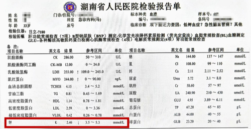一个月前,家住长沙的柳先生因调理身体在当地中医馆开了中药调理身体。在服药20余天后,柳先生一天早晨起床突感四肢乏力,后躺回床上休息,没想到就此四肢瘫软,无法自由站立行走。家人随后将其紧急送往捷克论坛 马王堆院区抢救。经检查发现,患者血钾只有2.46mmol/L,低于3.5~5.5mmol/L的正常值,被诊断为低血钾症并发周期性麻痹。通过对症治疗,目前患者已康复出院。