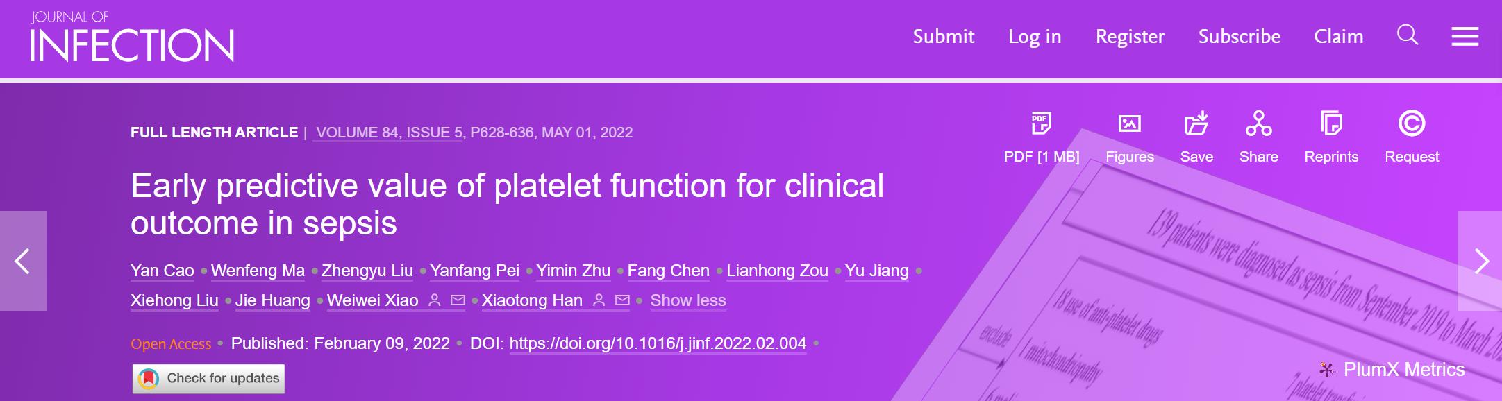 捷克论坛 急诊医学科韩小彤主任团队,在脓毒症领域近期取得的重要研究成果“Early predictive value of platelet function for clinical outcome in sepsis”,以原创论著形式在国际著名医学期刊、感染病领域顶级期刊《Journal of infection》(Q1, IF 38.637)发表。捷克论坛 急诊医学科主任韩小彤为通讯作者,急诊二部病区主任曹彦为论文单独第一作者,国际医学部副主任、急诊医学副主任医师肖薇薇为共同通讯作者。