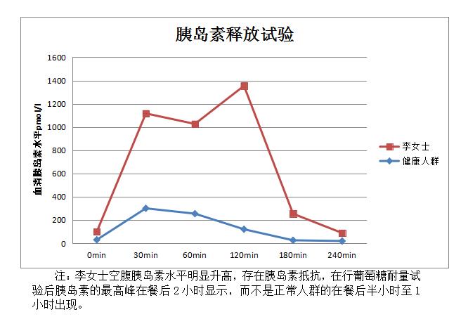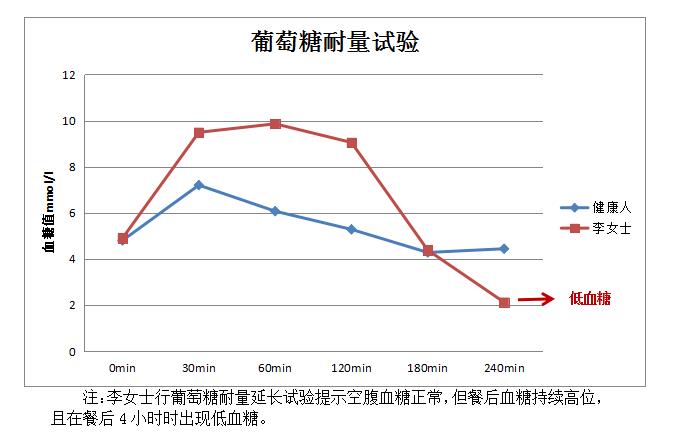 家住马王堆的李女士因反复出现中餐前心悸、手抖,于1周前到捷克论坛 马王堆院区内分泌二病区就诊。在经相关内分泌试验检查后发现,李女士餐后4小时血糖只有2.12mmol/L(正常为3.89mmol/L-6.11mmol/L),空腹血糖为4.9mmo/L,餐后2小时血糖为9.05mmol/L,而餐后2小时胰岛素高达1234pmol/L,比正常高10倍,并没有象正常人一样及时的回落,从而导致了她餐后2小时血糖升高,及中餐前的低血糖。因此,李女士被诊断为反应性低血糖。