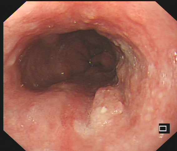 食管可见粘膜粗糙、糜烂、发红,局部可见结节样隆起