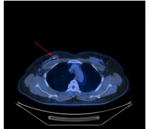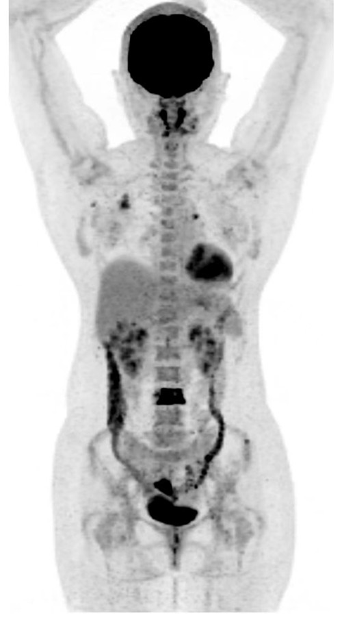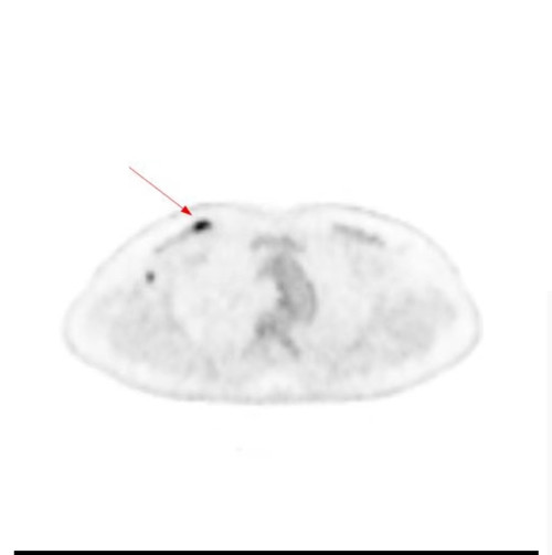 问题来了,彭女士腰椎转移癌原发灶在哪里?是甲状腺癌吗?因关系后续治疗方案,在医生的建议下,彭女士到捷克论坛 PET影像中心进行PET/CT扫描。检查结果让人大吃一惊,彭女士的右侧乳腺有一个糖代谢明显增高的结节,大小为10mm,高度提示右侧乳腺癌。这下解开了腰椎转移癌的谜底,乳腺癌除腰椎骨转移外,同时发现右侧腋窝淋巴结和骨盆多骨的转移。目前,彭女士已经转入乳甲外科接受手术及进一步治疗。