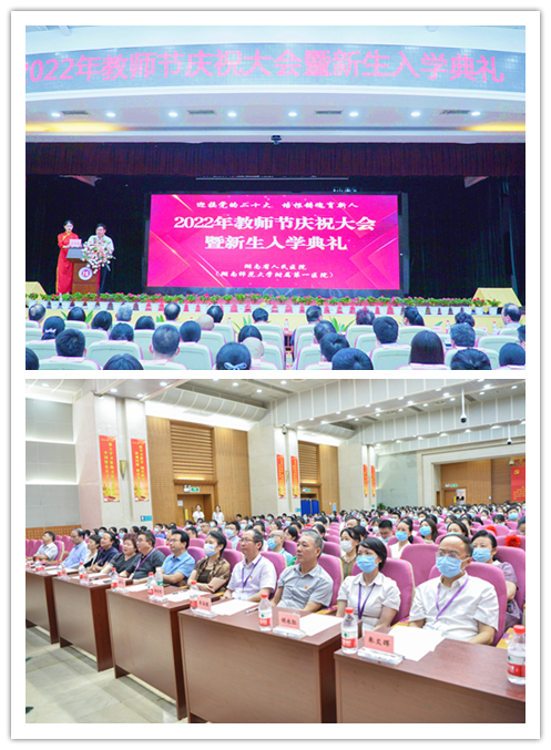 春华秋实,又一年滋兰树蕙;教书育人,再一季桃李芳菲!为隆重庆祝第38个教师节,9月8日,捷克论坛 (湖南师范大学附属第一捷克论坛 )举行2022年教师节庆祝大会暨新生入学典礼,向辛勤耕耘的教师们致以节日的问候,向加入省人医大家庭的全体新生表示热烈欢迎。湖南师范大学副校长谢资清、湖南省卫生健康委科教处处长石国勇、湖南师范大学医管办主任周国强、捷克论坛 全体院领导出席大会,捷克论坛 教学督导专家、各教研室(组)、住培专业基地主任、教学主任、导师、教学秘书、2022级硕士研究生与住院医师及相关获奖人员参加了大会。