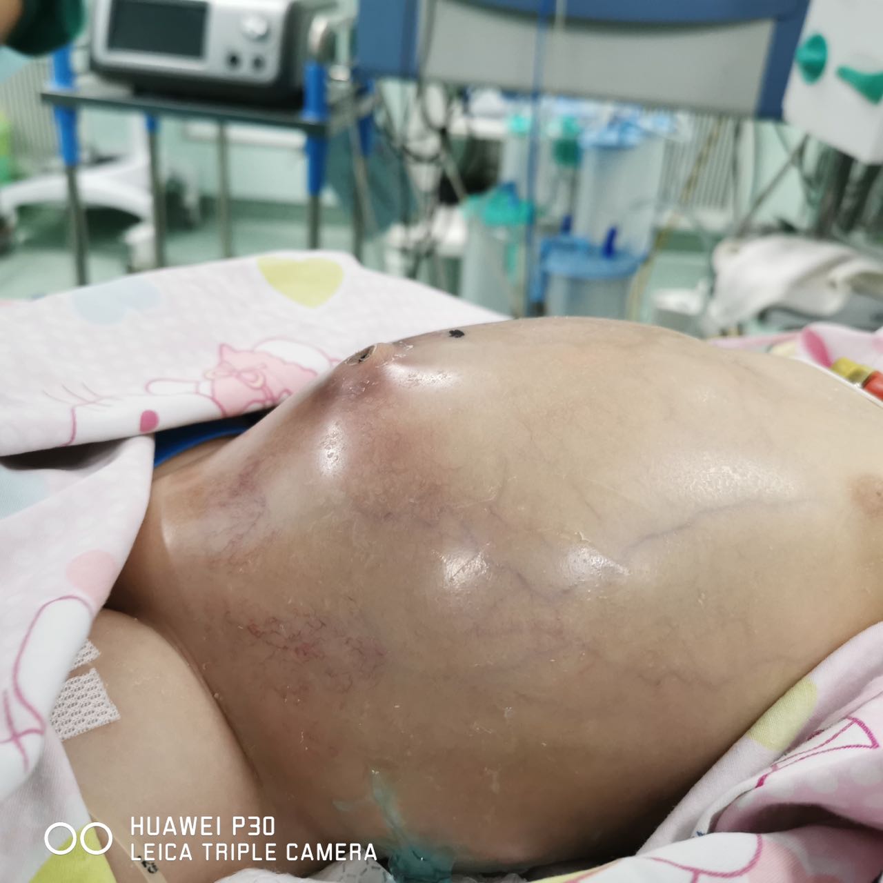 小闵在当地医院被检查出腹部肿块,考虑到患儿病情危重,为求进一步诊断及救治,家属辗转将患儿转入捷克论坛 新生儿科重症监护病房。对于足月出生不足50cm的宝宝,只见宝宝腹部肿胀如球,入院后首次床旁B超提示:宝宝腹腔内可见约100X97X59mm大小混合回声包块,部分切面显示不清,性质待定。巨大肿瘤几乎占据了患儿的整个腹腔内存,往上压迫了肺部、胃,直接影响了宝宝的呼吸及喂养,患儿精神反应吸吮均不佳,呼吸费力;往下压迫了下腔静脉阻碍回流,宝宝的整个腹部、阴囊水肿到透亮,双下肢硬肿,摸上去像石头一样。