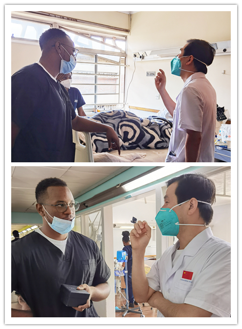 据悉,该患者为一名65岁老年吸烟男性,因呼吸困难、咳嗽、咳痰入院,排除新冠肺炎,经胸部影像、心电图、心脏彩超及抽血检查等检查考虑慢性阻塞性肺疾病急性加重,给予吸氧、祛痰、抗炎、舒张支气管等治疗后病情无改善。经仔细询问病史、详细体查,结合相关辅助检查结果,排除肺栓塞、气胸及心力衰竭等危及生命情况,其治疗效果差考虑未规范治疗有关。由于津巴布韦当地医疗条件有限,内科病房缺乏无创呼吸机及吸入用药,符代炎医生量体裁衣,在有限条件的基础上就该患者氧气治疗、药物合理使用及呼吸康复等方面提出建议性意见,并表示随后一段时间将会每天来查房监测患者的治疗效果。