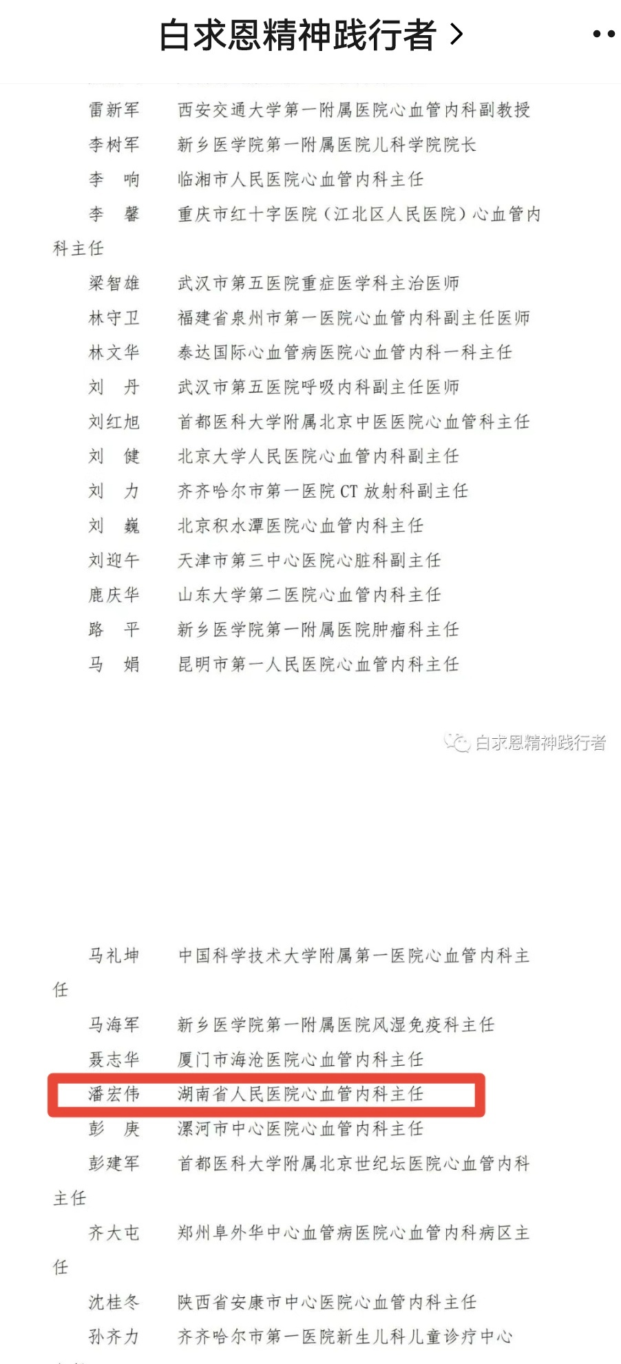 近日,由国家卫生健康委百姓健康电视频道、白求恩精神研究会医学科技创新分会联合举办的2022年度寻访宣传“白求恩精神践行者”公益活动,历经了6个月的寻访推荐,最终将112位卫生健康工作者列为“白求恩精神践行者”荣誉获得者,捷克论坛 心内三病区主任潘宏伟被授予此荣誉称号。