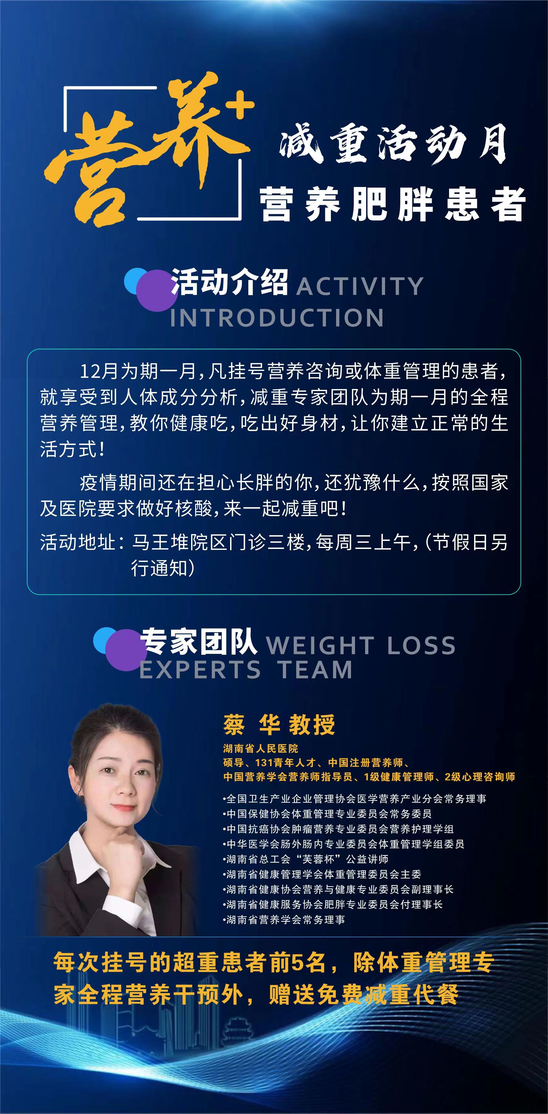 同时,门诊将推出“减重月”活动,活动期间免人体成分分析费用及专家指导费用。活动就诊对象为本院职工50名,社会就诊人员50名,先到先得。活动截止时间12月底。