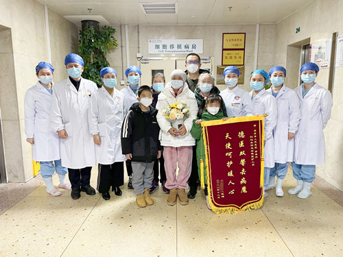 幸运的是,航航通过了配型和体检,顺利进入捐献程序。顽强度过5天艰难的动员采集干细胞后,回输时他和妈妈视频,“妈妈,你放心,医生阿姨说我的干细胞质量很好,一定可以治好你。”。王芬动容地说,“真的没想到,最后竟然是儿子救了我,再难我也要撑下去。”凭着这股信念,她一直保持乐观的心态,在细胞移植医护团队的精心治疗下,历经二次预处理化疗、感染、出血等风险,儿子的干细胞成功植入,命运多桀的她终于赢来了新生。当她出舱的那一刻,在场的人无不动容,为航航的勇敢点赞,为王芬的坚强感动,并祝福她出舱后也能顺利度过排异等各种难关。