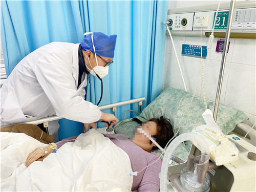 李建民主任与李建群护士长查看一位气管插管的新冠危重症患者。