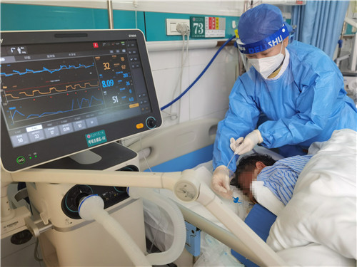 新冠病毒感染者病情发展中出现了肺炎,甚至“白肺”,可能是重症预警,重症的白肺患者,死亡率在40%以上。位于马王堆院区的呼吸五病区,也是最早用于收治新冠重症患者的病房,科室挂牌老年呼吸内科,在老年呼吸疾病及重症救治方面有丰富经验。用于收治新冠重症病人以后,由原来的5张重症病床,变为一半床位用于重症救治,收治的病人80%是大于65岁的老人,目前有创机械通气的病人10余人,无创呼吸机及经鼻高流量氧疗20余人,每天都面临繁重复杂的抢救和插管治疗。