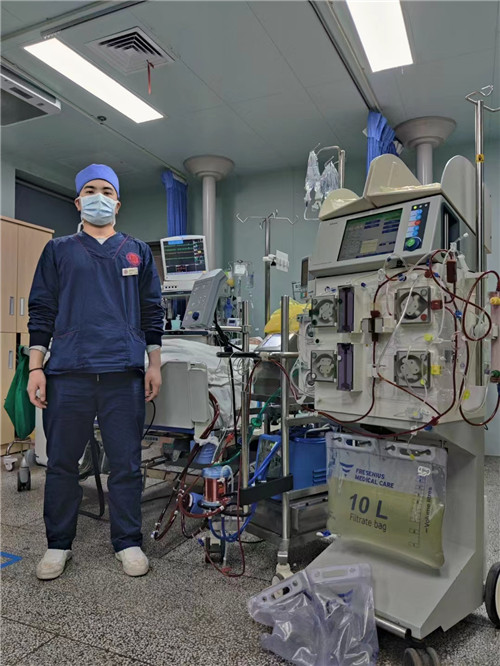CRRT治疗组长杨桓为张爷爷做床旁血液透析滤过治疗。