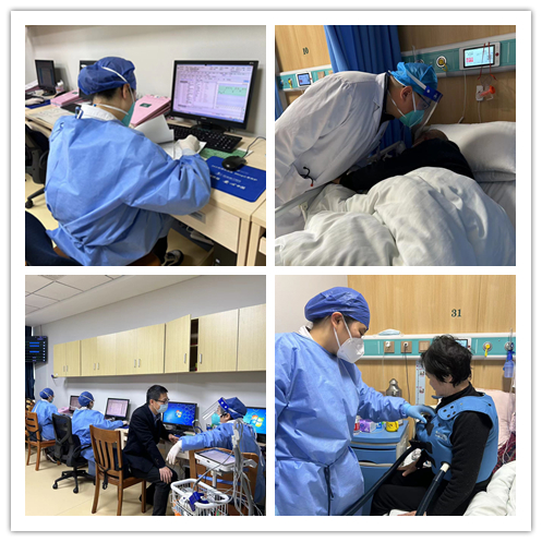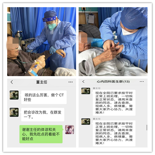 董波主任更是以科室为家,时时刻刻都能在科室看到他的身影,有时凌晨都在帮一线医生抢救、收治病人。除了每周日常的门诊,董波主任下了门诊以后还会来科室查看危重病人。查房的他,总是耐心地听病人讲述症状,细致地查体。坚持做好患者的“双心”治疗。92岁的李老因基础疾病多,新冠感染后心衰症状加重,心理负担重,董波主任会每天不定期看望李老,指导治疗并做好心理安慰。经过精心的诊治,李老症状明显缓解,亲切地握着主任地手说,“感谢董主任,有你在我就心安!”