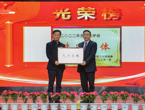 祝益民副主任向谭李红院长颁发“2022年度绩效评估先进集体”奖牌