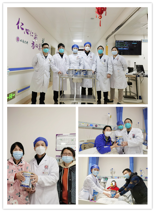 春节期间,许多人都能和家人欢聚一堂。然而,部分患者因为病情原因无法回家与亲人过年团圆。心内六病区为了让住院患者也可以体会到年味,科主任欧柏青与护士长彭晶晶带领全科医护人员给患者送去新春礼物。在礼品发放过程中,欧柏青主任与彭晶晶护士长不断鼓励患者坚定信心,保持乐观健康的心态面对生活,并将营养奶粉送到每一位患者手中,以此表达对他们的关心和节日祝福。