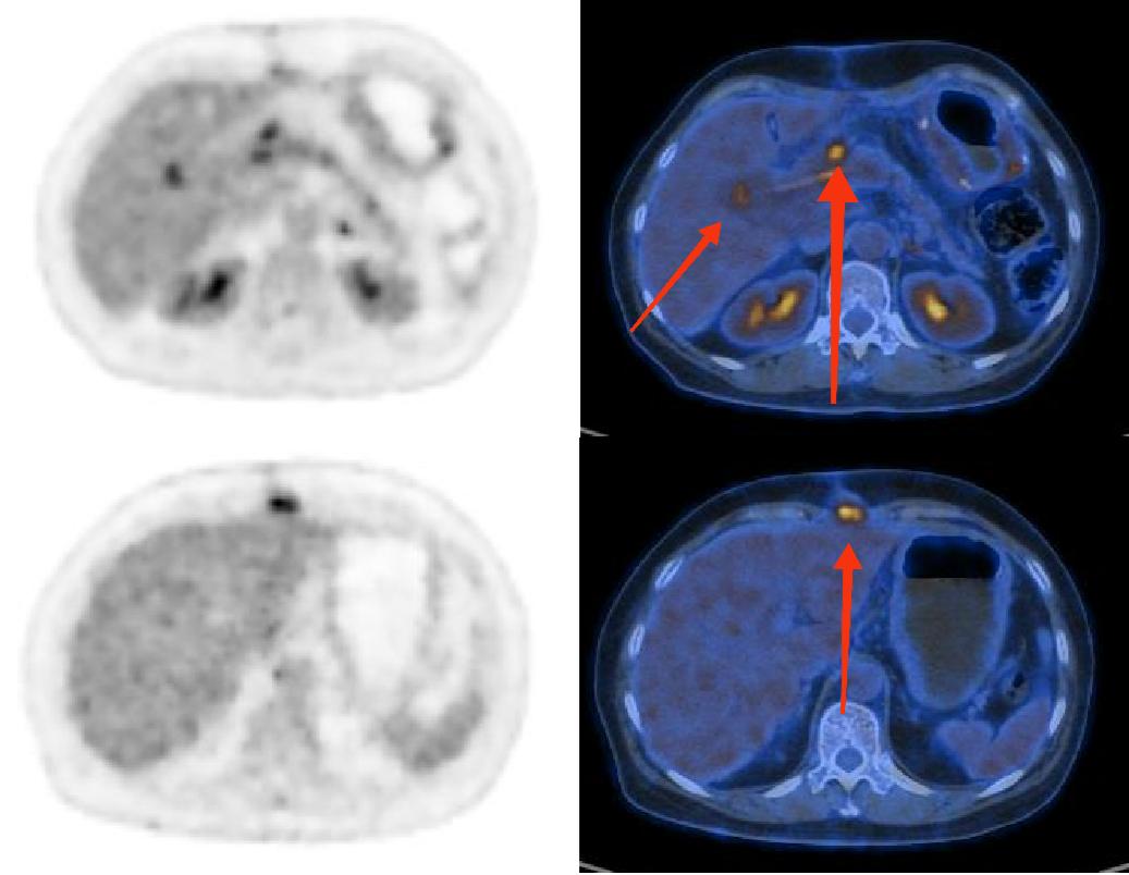 图为18F-FDG PET及PETCT图像。上图两枚红箭头所指为胰十二指肠切除术后吻合口处高代谢病灶,不能完全排除是否为肿瘤术后复发病灶;下图红箭头所指为切口皮下高代谢软组织灶,不能完全排除是否为肿瘤转移灶。