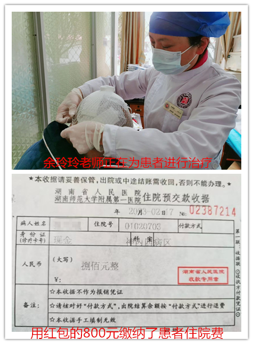 2月17日上午,急诊二部伤口治疗师余玲玲在给患者做完治疗后,意外发现电脑键盘下放着一个厚厚的红包,她赶紧追出去想把红包还给患者却没有追上,下班后立即把800元红包给患者缴纳了住院费。