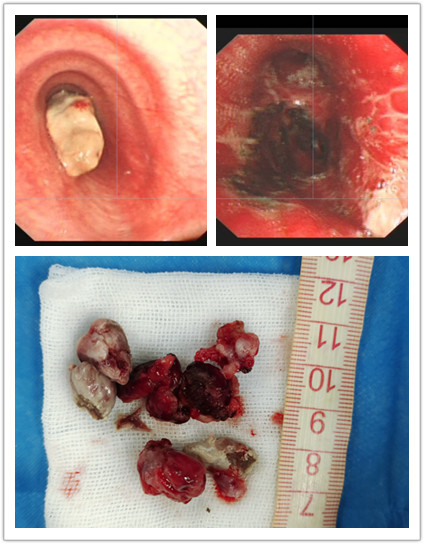 病人送入支气管镜室后,病人在吸氧情况下血氧饱和度波动在85%,仍处于严重缺氧状态。谭建龙副主任医师立即对病人进行了内镜评估,发现肿瘤已经完全堵塞左主支气管,采用电圈套、冷冻等多种肿瘤消融手段迅速切除左主气管内肿瘤,使左肺管腔基本通常,治疗结束时患者呼吸困难迅速缓解,不吸氧情况下血氧饱和度迅速回升至95%以上。