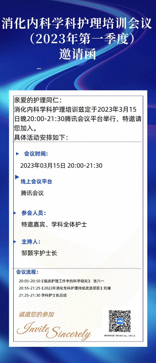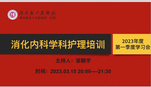 3月15日晚,消化内科学科护理培训会议(2023年第一季度)于网络会议平台上顺利完成。在邹颢宇、曾敏婕、胡薇华、叶霖、李丹四位护士长的积极组织下,学科内非值班护理同仁全员参加,工作之余求知共议,收获匪浅。