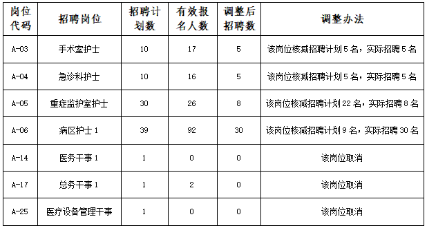 根据《长沙县人民捷克论坛 (捷克论坛 星沙院区)2023年2月公开招聘编外工作人员简章》有关要求,经网上报名、修改报名条件、延长报名时间、资格初审后,部分岗位因有效报名人数不足,未达到开考比例,现予以调整,其他岗位招聘计划数不变,具体调整情况公告如下: