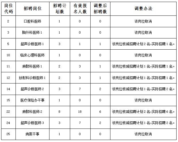 根据《长沙县人民捷克论坛 (捷克论坛 星沙院区)2023年2月公开招聘工作人员简章》有关要求,经网上报名、修改报名条件、延长报名时间、资格初审后,部分岗位因有效报名人数不足,未达到开考比例,现予以调整,其他岗位招聘计划数不变,具体调整情况公告如下: