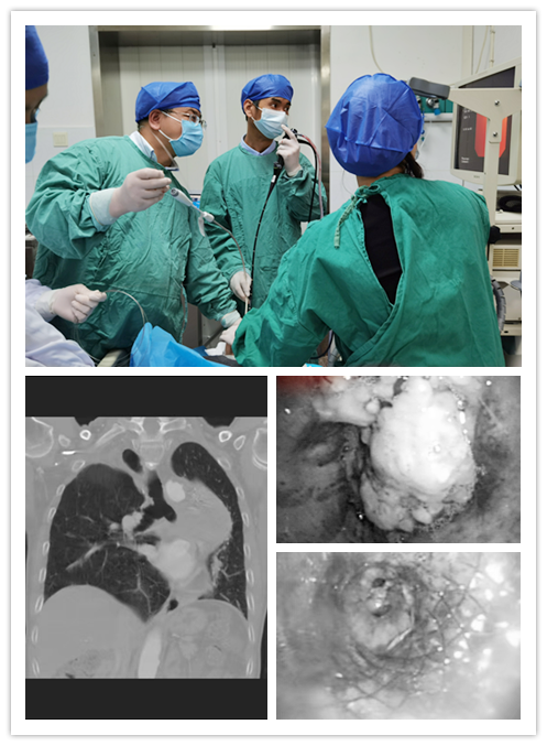 家住长沙芙蓉区的75岁黄老先生,三年前被确诊患上左肺鳞癌。在行手术治疗后,黄老先生于去年7月因肺癌复发行全身化疗,并在左肺上叶植入放射性粒子治疗。今年3月,由于病情进一步恶化,黄老先生出现进行性呼吸困难。4月9日,黄老先生因呼吸困难,血氧饱和度下降被紧急送人马王堆院区急救。经检查发现,患者左主支气管已被肿瘤完全堵塞,并已导致严重呼吸衰竭,被收住呼吸五病区ICU。在通过予以无创呼吸机辅助通气等治疗后,患者血氧饱和度上升,但呼吸困难仍无明显改善和平卧,当务之急是尽快为患者去除气道内肿物打开气道。