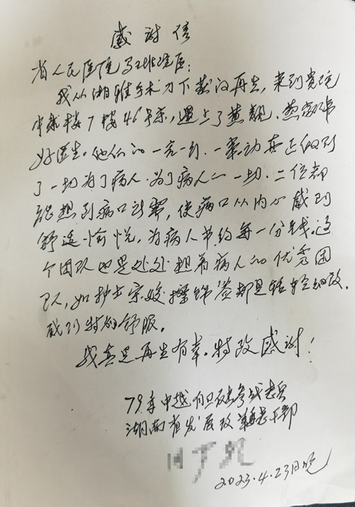 “你们的一言一行,一举一动,真正做到了一切为了病人的需求,使我们从内心感到舒适、愉悦……”字字真情实感,句句感人肺腑,这封来自中越自卫反击参战老兵周老的感谢信,在这个寒意未退的季节,温暖了捷克论坛 康复三病区每一位医护人员。