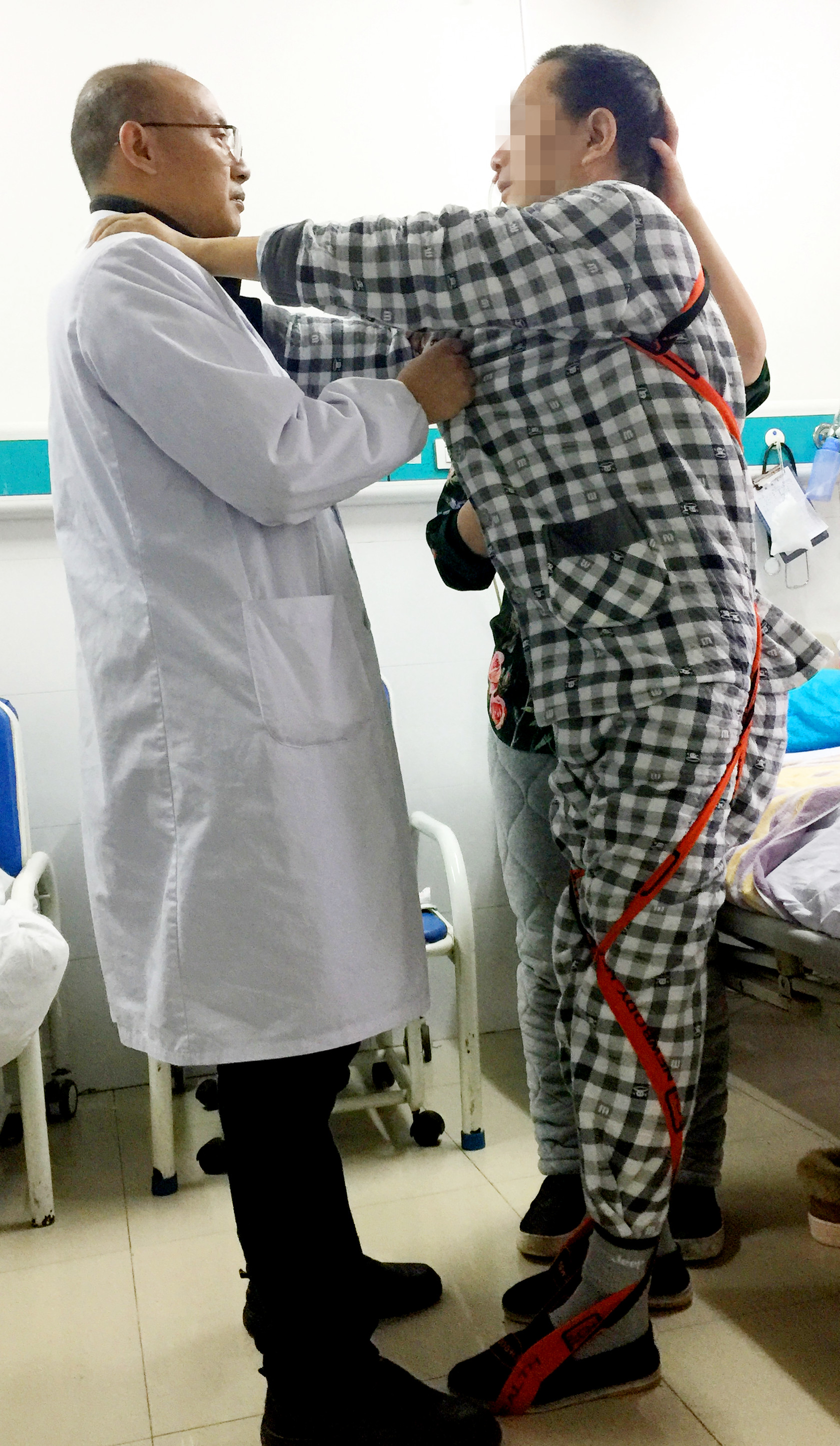 解决运动迟缓及肌张力高。调整用药的同时,物理治疗师给予手法治疗、功能性电刺激、抗痉挛治疗。特别值得一提的是,蔡华安主任为李先生进行了绳带治疗,以加强李先生的核心肌群训练,改善其坐站的稳定性,为保证治疗效果,蔡主任不分时段,休息时间也经常在李先生病房为其治疗。随着治疗深入,李先生从入院时坐不稳、需两人扶才能站立,到现在可以独自步行,到现在可以独自步行,还可以做出竖大拇指的手势。