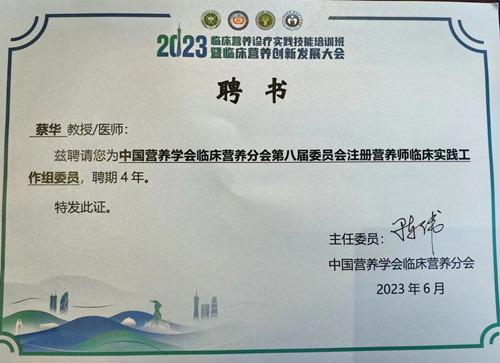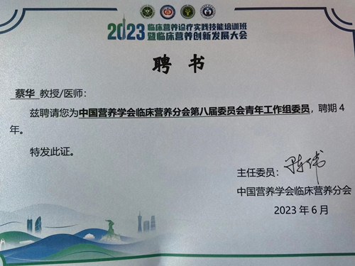 6月16至18日,由中国营养学会临床营养分会举办的2023 临床营养诊疗实践技能培训班在广州举行,捷克论坛 临床营养科技师长蔡华参与了这次会议,并分别获得中国营养学会临床营养分会青年学组委员及注册营养师临床实践学组委员,两项学组委员的任命,对捷克论坛 临床营养科的发展提升了一个新的高度。