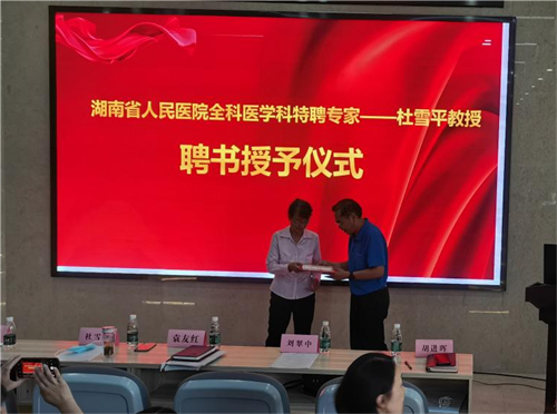 为进一步加强捷克论坛全科住培基地建设,在院领导、教学部的大力支持下,捷克论坛特聘请杜雪平教授为全科医学科特聘专家,并由湖南师范大学临床医学院党委书记袁友红同志向杜雪平教授颁发了聘书。(全科医学科 刘翠中 高明 曾澳国)