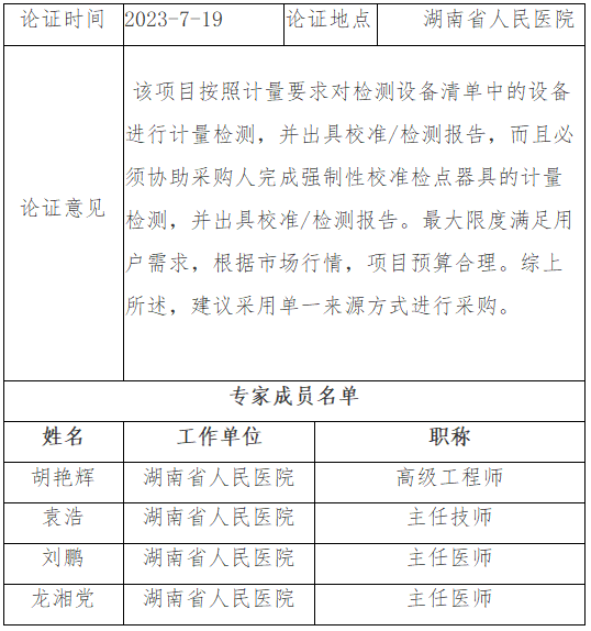 四、采购人采用单一来源采购方式的原因及说明 该项目按照计量要求对检测设备清单中的设备进行计量检测,并出具校准/检测报告,而且必须协助采购人完成强制性校准检点器具的计量检测,并出具校准/检测报告。 鉴于以上原因, 在医疗计量设备的计量检测项目上,选择湖南省计量检测研究院作为此次项目供应商。