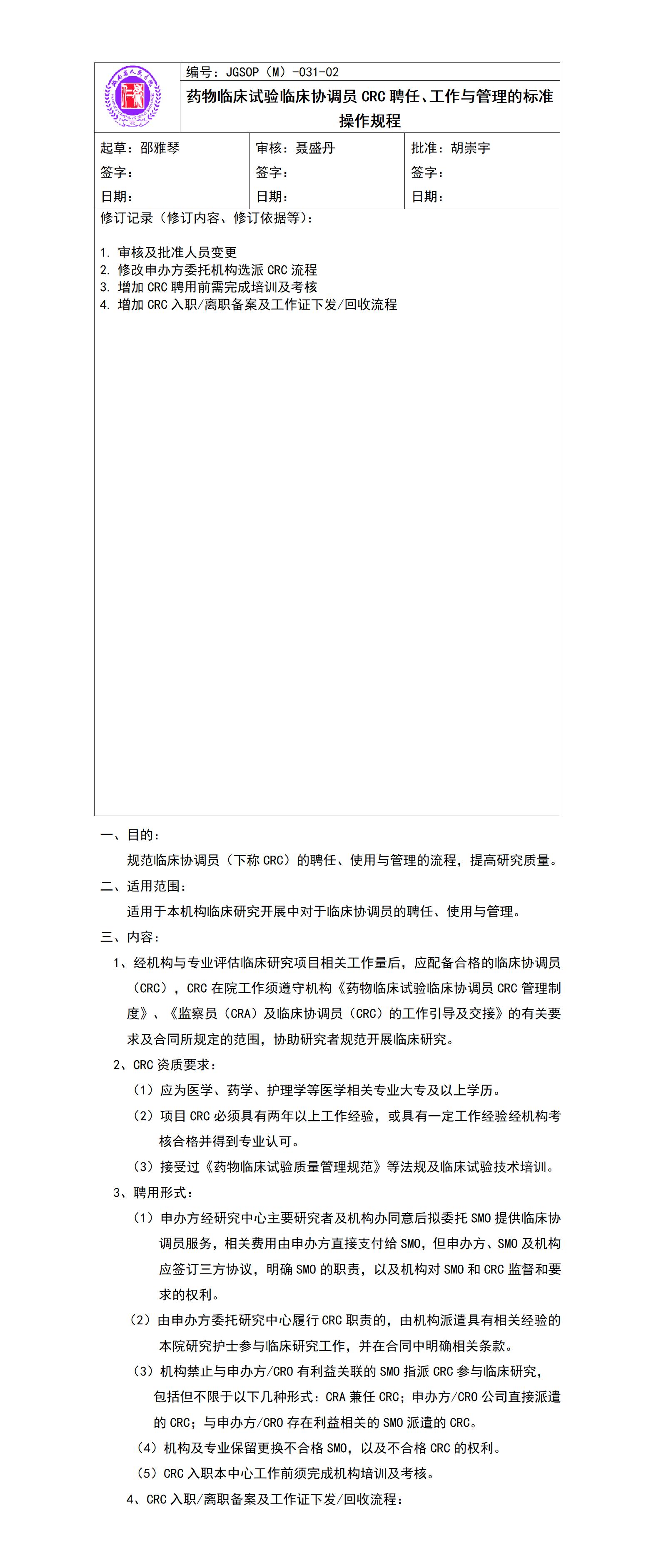 临床试验临床协调员CRC聘任、工作与管理的标准操作规程