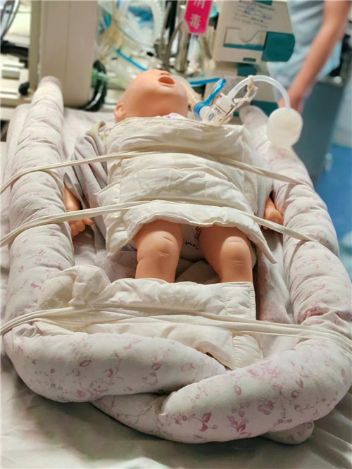 目前患儿已经11个多月,体重将近9.2kg,加上返程时气管切开与呼吸机管路相连占比空间大,考虑到现有转运温箱多为新生小宝宝使用,空间大小上存在不足,出发前一周,科室紧急联系了一体化转运温箱工程师就温箱配置细节做了个性化整改。同时,科室高层级护士就转诊转运过程中急需与备用的特殊物资(气切包、硅酮减压泡沫敷料等)、特殊情况预案都提前准备并做出了相关模拟演练,针对于患儿特殊病情需求,还多次组织理论与操作学习。