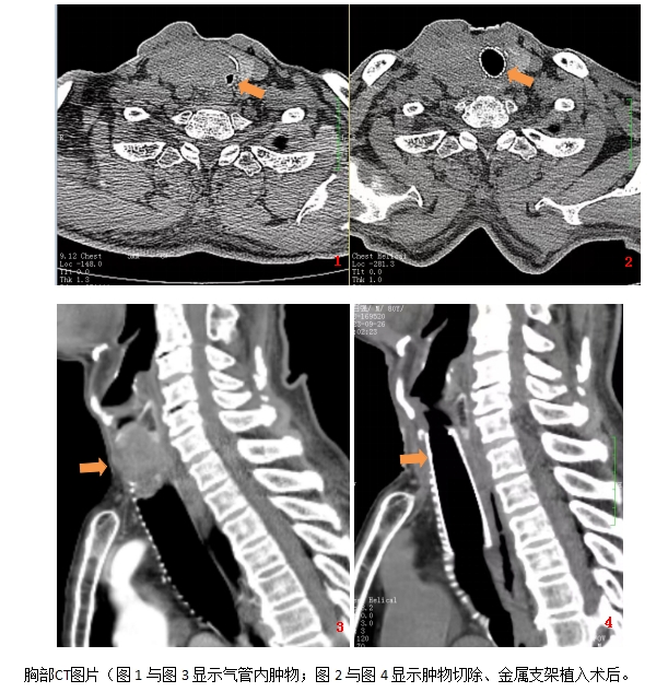 在呼吸五病区副主任罗曼主任医师及重症介入组陈云荣主任医师术前详细讨论手术方案,并做好充分准备的前提下,9月25日,陈云荣介入团队给患者在支气管软镜下进行了介入治疗。手术前,医护团队通过预先放置吸痰管接氧气保证氧合,并在切除气管内大部分肿瘤、植入金属覆膜支架后,用手术缝线把支架固定在气管壁上。手术十分顺利,术后患者呼吸困难显著缓解,复查胸部CT支架位置良好无移位,患者及家属感激不尽。