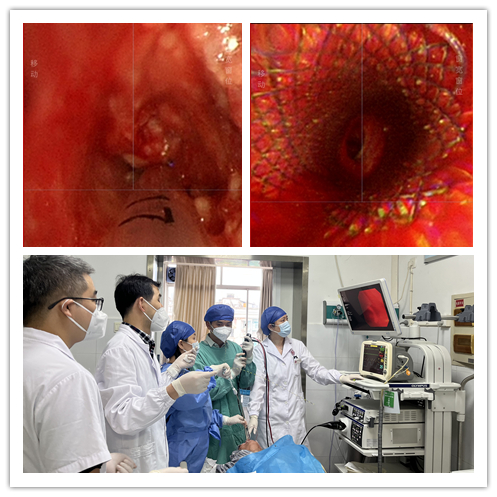 家住长沙的80岁李先生,因重度呼吸困难就诊于呼吸五病区。经相关检查明确为甲状腺癌长入气管,使气管只剩下一条狭窄的缝隙,引起严重呼吸困难。因已经无法手术,所以支气管镜下切除气管肿物并植入金属支架是缓解病情的首选治疗。但由于患者肿物离声门不到1cm,气管几乎完全堵塞,支气管软镜治疗风险大,且放置的金属支架极易移位。
