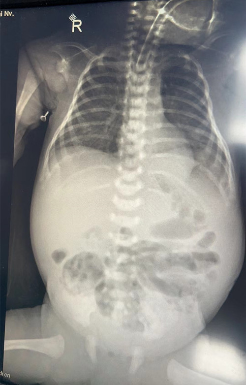 转运转诊前,患儿腹胀如鼓,精神反应差