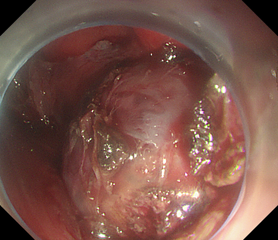 经过充分的准备,在麻醉科、普外科的支持下,刘鹏主任带领消化科内镜医护团队为龙女士实施了手术。术中用胃镜经口进入胃内找到病变压迫位置,在胃壁上切一个切口以便于胃镜顺利进入腹腔,观察到肿瘤组织基本全部位于胃外,然后逐层分离肿瘤组织,仅一小时不到将肿瘤完整地剥离。由于瘤体过大,切除后难以拖入胃腔,通过贲门困难。刘鹏主任巧妙地使用圈套器通过胃镜钳道口穿过胃壁切口将瘤体完整拖入胃腔,再用取石网篮将瘤体通过胃和食管,从患者的嘴巴里掏了出来后,再用数枚钛夹完美地闭合了的创面。精湛、细致的手术技巧,娴熟的瘤体切除步骤,果断的血管预先电凝处理,让整个术中未见明显出血,同时保留了器官功能。