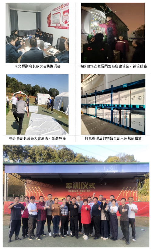为确保救援工作的顺利开展,朱文辉副院长多次召集协调会议,并与杨介良部长冒雨现场指挥,解决难题。团队利用周末时间将物品运送至演练基地,冒着低温雨水天气连夜搭帐篷、安装设施设备、接通水电气。仅用2天时间,现场后勤工作就准备就绪,保障了救援演练及评审工作的开展。