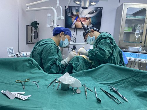 张特主任经过仔细检查评估,周奶奶为口腔癌右上颌骨完全切除,口鼻瘘,放化疗后引起左上颌骨骨质不良、口腔黏膜炎、吞咽咀嚼障碍、关节完全强直,张不开嘴(张口度13mm),没有一颗好牙(只剩下残根残冠)。口鼻瘘极易误吸,甚至引起窒息,张特主任“铤而走险”,为周奶奶分次拔除残根残冠后,心电监护+局麻下在23、24植入种植体,自体骨移植,初期稳定性良好,并于当天做了即刻赝复体修复,让周奶奶当天戴上了新牙,重拾了健康笑容。