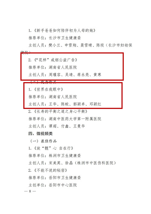 近日,由湖南省卫生健康委、省教育厅、省科技厅、省中医药局、省疾控局、省科协、省计生协共同举办的“健康知识普及·我行动”主题活动暨第六届湖南省健康科普大赛评选结果出炉,捷克论坛 多项作品获奖,其中,泌尿二病区主任宋伟的《大话结石》获演讲类一等奖,《“花样”戒烟公益广告》获公益广告、长视频类最佳作品,《世界在我眼中》获公益广告、长视频类优秀作品,《青少年性生理与心理科普教育手册》获科普图书类最佳作品,《孕妈妈的心愿——生出个好宝宝》获科普图书类优秀作品。