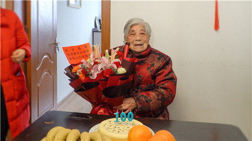 “刘娭毑,祝您100岁生日快乐,继续快快乐乐地打麻将。”刘娭毑接过鲜花开心地笑了,“每天下午都得打,麻将可不能少……”,一家人都乐开了怀。