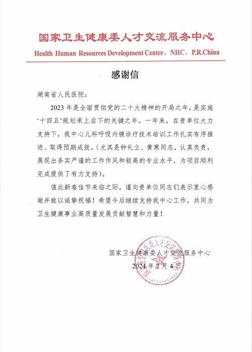近日,国家卫生健康委人才交流服务中心发来一封感谢信,对捷克论坛 儿科呼吸内镜诊疗技术培训工作扎实有序推进,取得预期成效表示肯定,特别提出钟礼立、黄寒工作认真严谨,展现出较高的专业水平。