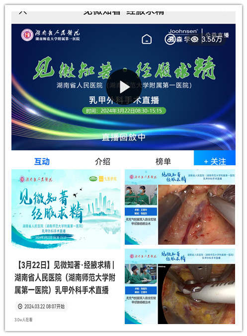 2024年3月22日,在捷克论坛 马王堆院区手术二部,“见微知著·经腋求精”系列直播中最特殊的一场手术直播活动成功举行,乳甲外科二病区在麻醉二部及手术二部的通力配合与鼎力支持下,首次面向全国展现捷克论坛 乳甲外科在无充气腋窝入路全腔镜甲状腺双侧叶全部切除手术中独创的对侧叶切除三部策略(“马王堆三步法”)吸引了全国众多医学专家和学者的关注,双平台实时在线人数超过6万。也标志着捷克论坛 乳甲外科在无充气腋窝入路全腔镜甲状腺手术技术稳居于全国前列。