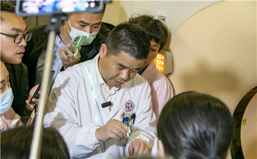 下午的模拟操作中,蒋永亮主任认真教学,并鼓励学员们上手操作、沉浸式体验手术的方式方法,期间,蒋永亮主任及经皮肺穿团队对学员们的提问给予答疑解惑。在真人手术环节,蒋永亮主任、李超医师同胡晓护师默契协作,在CT室一气呵成完成数台经皮肺穿刺手术,精彩的手术演示不禁让各位学员热情高涨,每台手术都应用了第四代穿刺导向装置,这套装置经蒋永亮主任不断探索和创新开发,实现了更为精准的穿刺,深受欢迎。