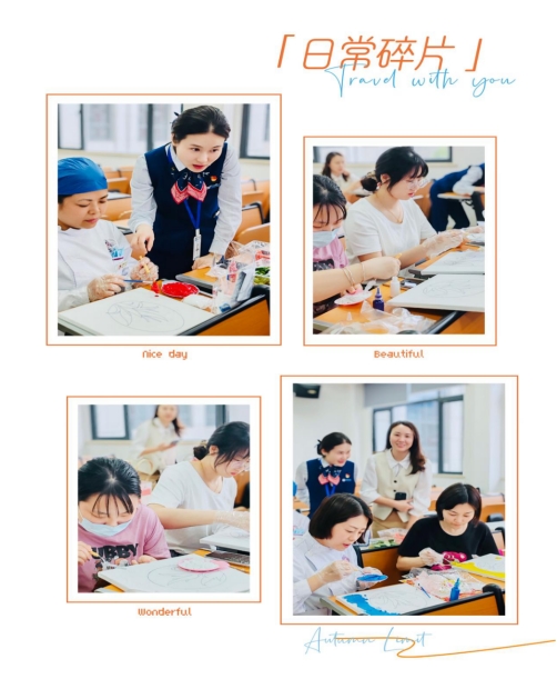 拿着颜色图案各异的材料,护士姐妹们冥思构图,在双双巧手下,小心翼翼地设计、剪裁和粘贴……每一步的操作,都细致认真,力求完美。经过大家的精心制作,一幅幅美丽生动、各具特色的浮雕画展现在大家的面前。