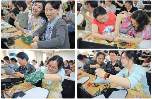 大家认真聆听了老师讲解的制作步骤和材料使用方法后,全身心地投入到制作中,一笔一划,一针一线,认真地裁剪,仔细地填充,每一个环节都力求完美精细。“老师,要怎么缝才好看呢?”,“老师,里布和表布之间要留空间吗?”大家边制作边请教,有模有样兴致勃勃,在一片欢声笑语中,一个个端庄秀丽的手镯包纷纷诞生。大家时而互帮互助,时而相互点评,时而三三两两邀约合影,都开心不已,对自己的作品更是爱不释手。