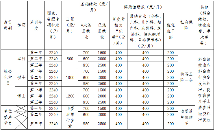 1、对面向社会招收的住院医师,培训基地按规定为其购买五险一金。在培期间的工资待遇包含专项补助、工资和绩效奖励三部分。
