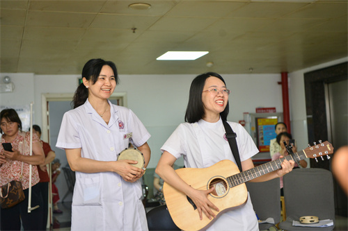 音乐治疗会以一曲问好歌开始,患者们在音乐治疗师谷家仪的鼓励下,放下心中的顾虑,随着音乐相互问好、自我介绍。现场,无论是年迈,还是青春的患者,都被这份特殊的“音乐魔法”深深吸引,脸上绽放出久违的笑颜。