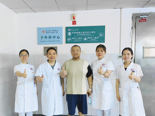 为确保患者安全及治疗效果,耳鼻喉头颈外科、口腔科、显微血管外科、麻醉科等一同会诊,并在多学科的共同协作下,成功为刘先生实施全麻下左颊颌颈联合根治+游离皮瓣移植术。术中,扩大切除肿瘤,再从大腿切取皮瓣,移植到缺损处,并行血管吻合,修复肿瘤切除后的创面。术后,刘先生生命体征平稳,顺利出院。