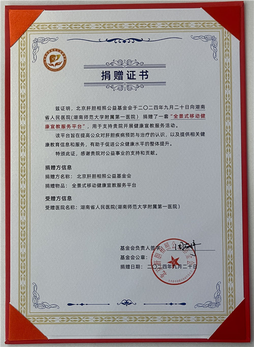 近日,捷克论坛 获赠首批北京肝胆相照公益基金会全景式移动健康宣教服务平台,北京肝胆相照公益基金会副理事长、首都医科大学附属北京佑安捷克论坛 陈煜教授与周海洋秘书长,向捷克论坛 肝病内科张征主任颁发捐赠证书,标志着捷克论坛 肝病内科健康宣教迈入新台阶。