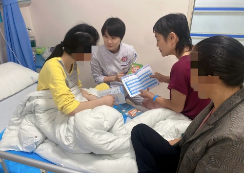 彭晶晶护士长和患者周姐给37床小姑娘做心理疏导
