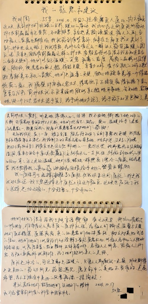 这段温暖的话来自近日捷克论坛 心血管内科六病区收到的一封长达三页的手写表扬信。这封表扬信是患者周姐写给心血管内科六病区彭晶晶护士长团队的,她被她们的温暖和耐心深深感动,于是亲手写下了这封饱含深情的表扬信。